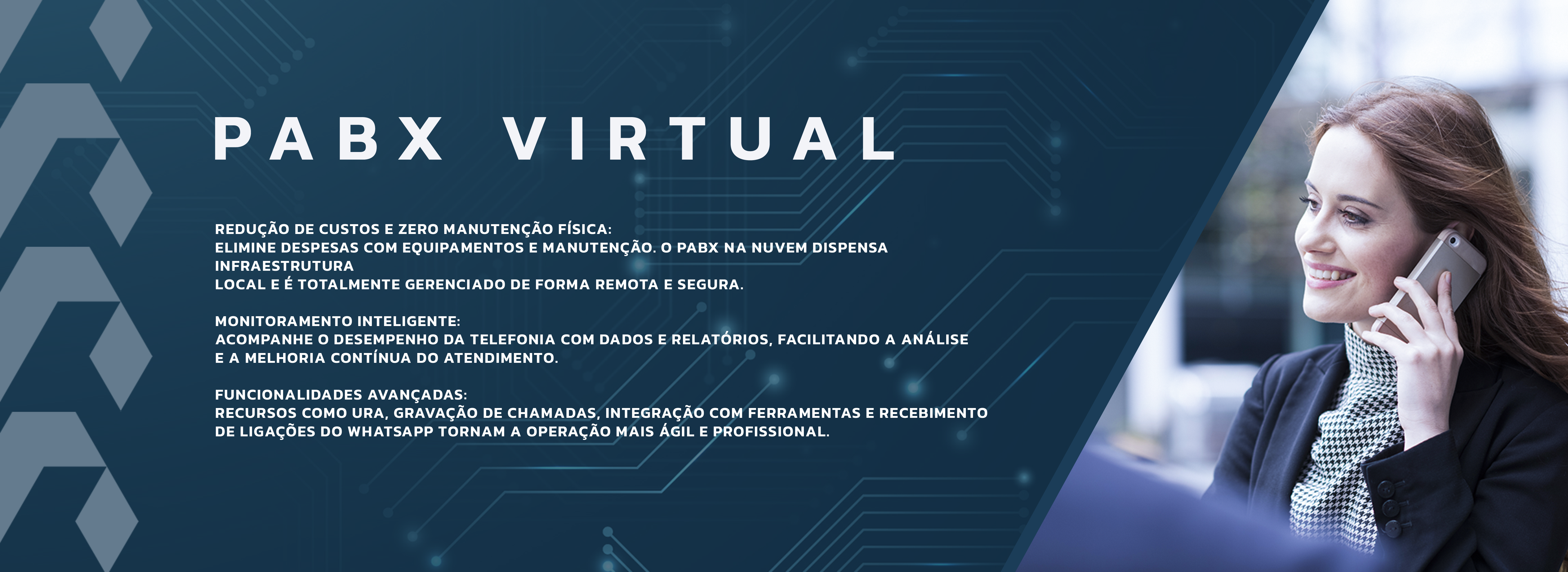 Recursos: os PABXs virtuais oferecem uma série de recursos que podem ajudá-lo a melhorar sua comunicação, como chamadas em conferência, roteamento de chamadas, transferência de chamadas e bloqueio de chamadas.